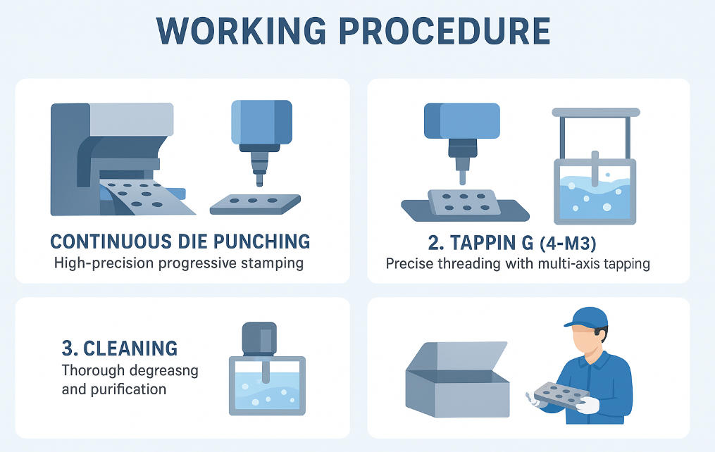 Hot dip galvanized sheet is a metal stamping part made of blanking, bending and stamping through 160t punch compound die, and then tapping